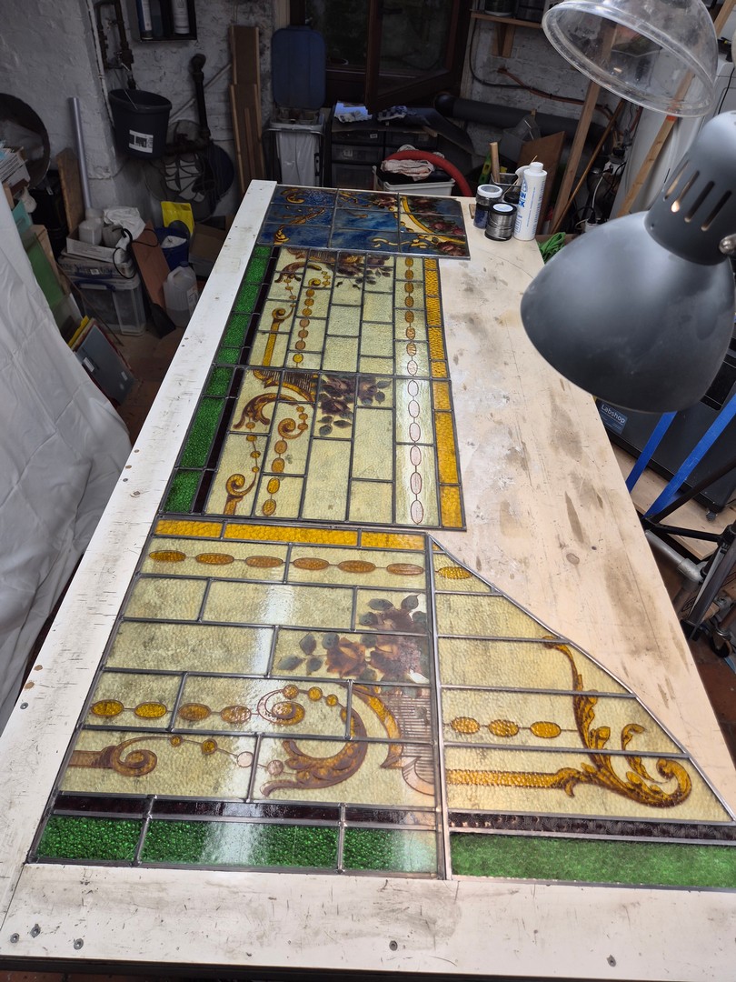 Gebrandschilderd glas vervangen we of retoucheren we met lichtechte pigmenten.