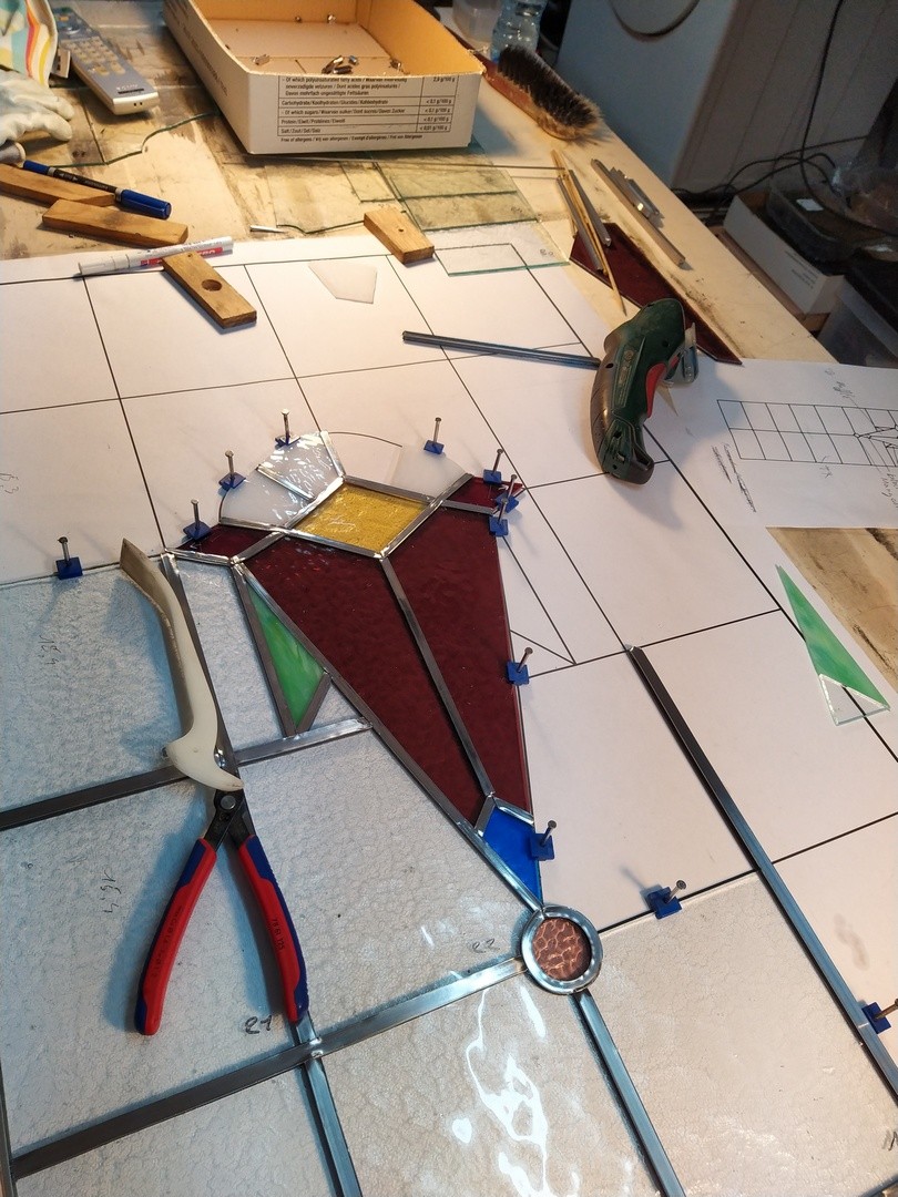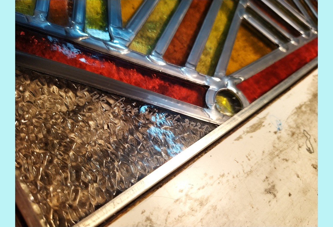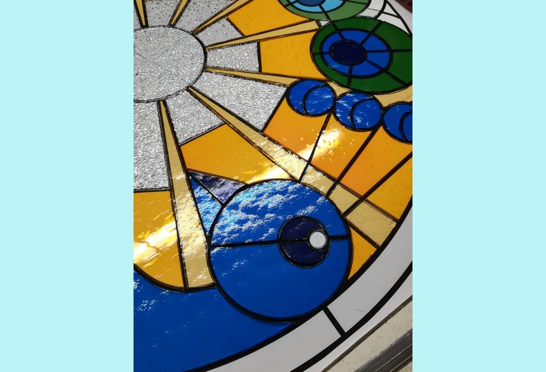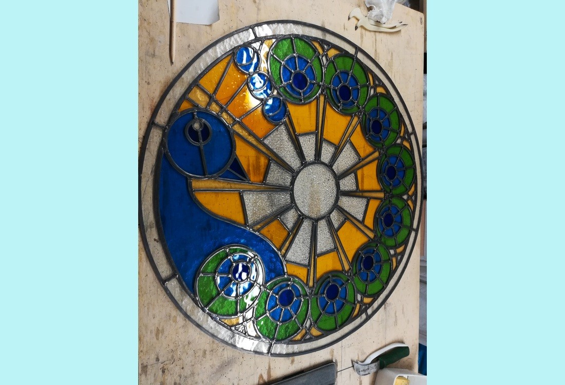 Het geheel werd gesoldeerd en gepatineerd en aan de achterzijde bevestigden we een windroede op de loodprofielen. In samenwerking met onze schrijnwerker zetten we het paneel ook vast in een solide houten frame dat verankerd werd in de buitenmuur. We kozen voor maximale stevigheid en veiligheid gezien de bijzondere omvang (1 meter diameter) en plaatsing (aan een achtergevel, vol in de wind). “Tijdens het douchen, dompelen we ons nu ook onder in de glaskunst van Yves”, aldus de zeer tevreden opdrachtgever.