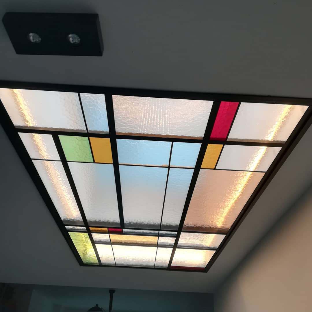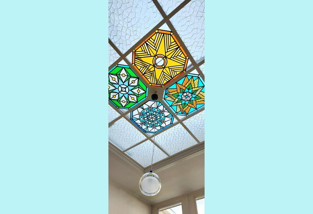 Met een raster van 16 vakken biedt de lichtkoepel in deze burgerwoning heel wat mogelijkheden voor een decoratieve invulling. Een XL-variant van OXO was een optie, maar dit gezin koos voor een eigenzinnige kijk op de klassieker ‘de 4 seizoenen’ (later komen er nog 12 sterrenbeelden rond, zo beloofden ze ons).