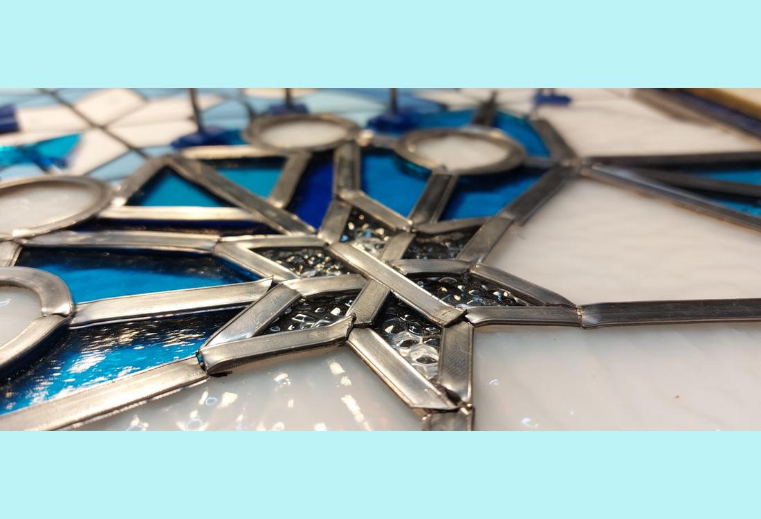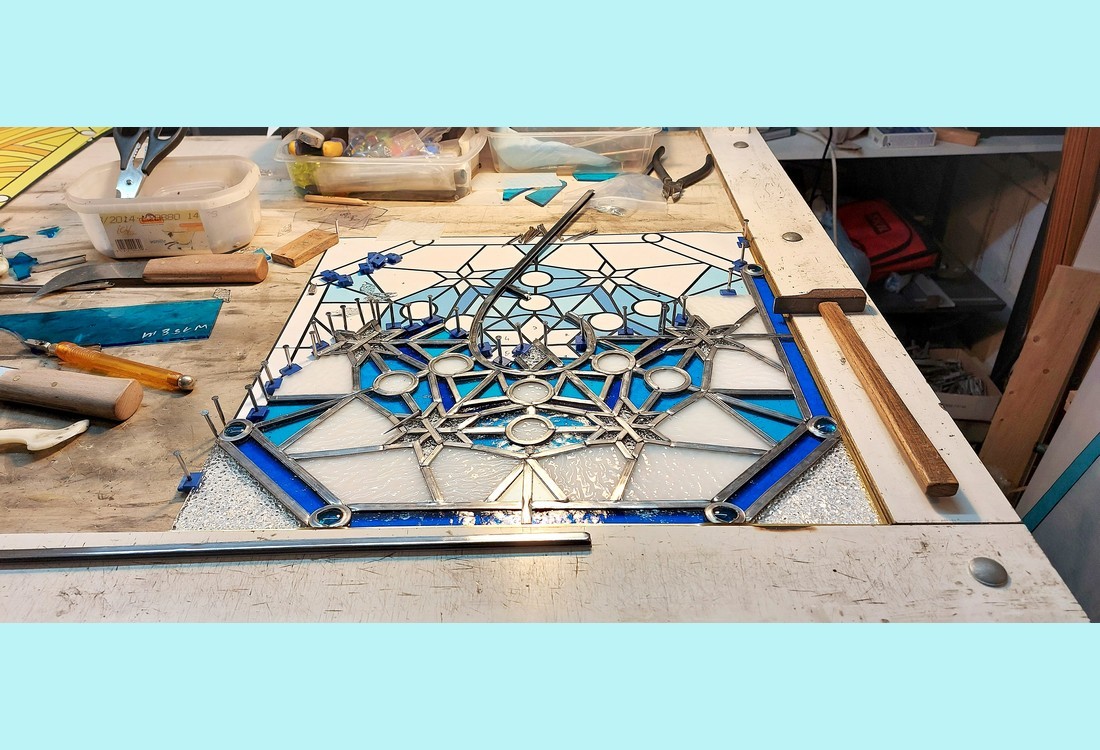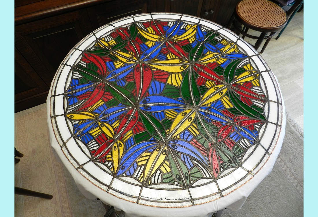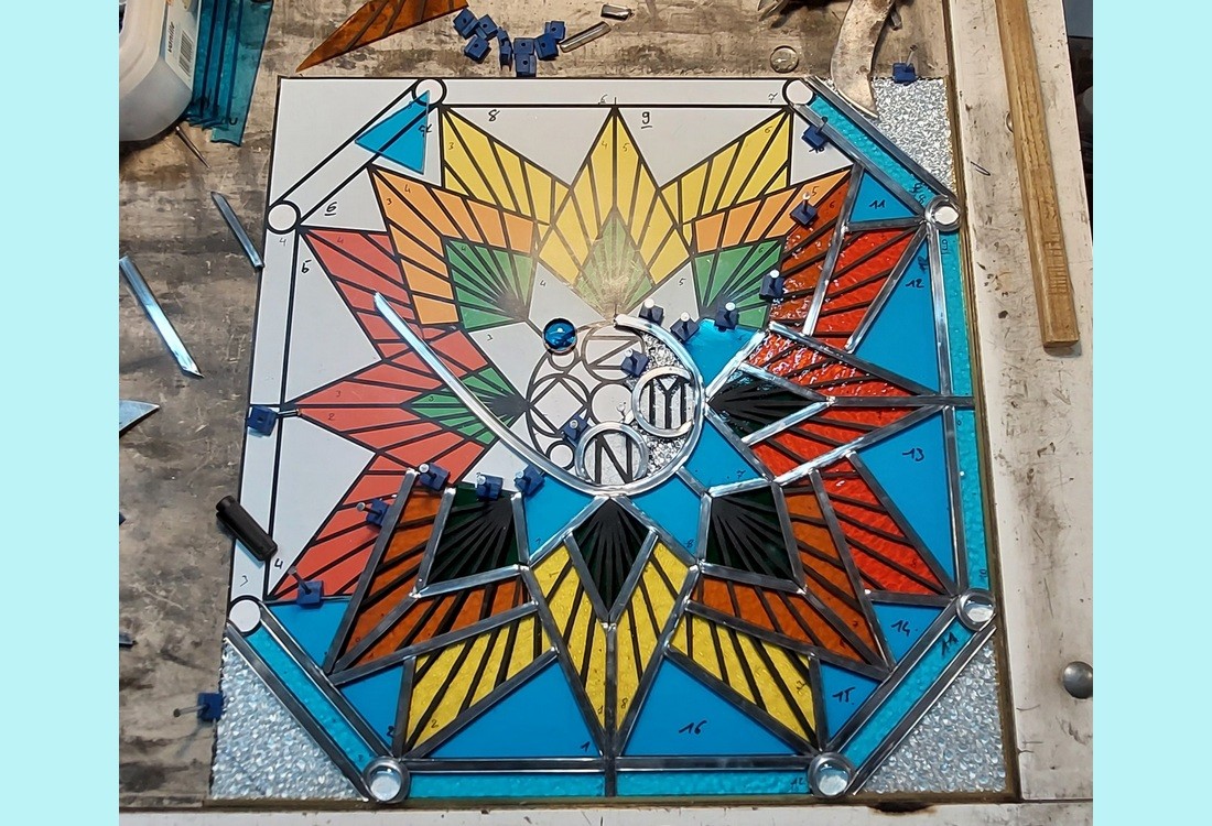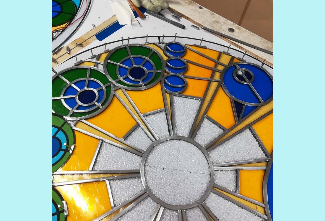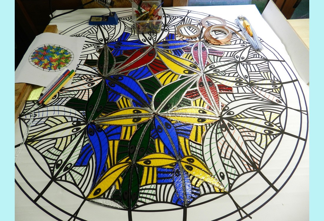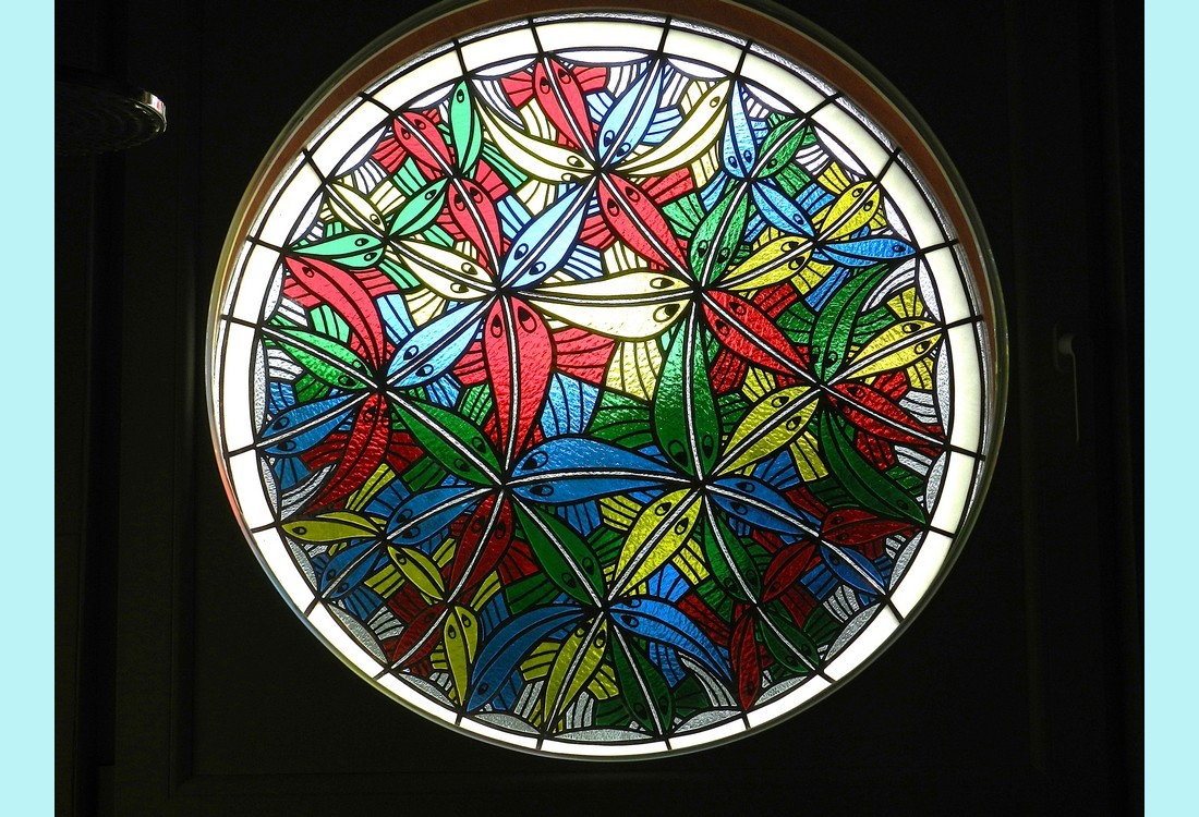 In het thema “water” vond hij inspiratie bij de geometrische vissen van Escher’s ‘Circle Limit III’. We adviseerden de klant om het kunstwerk om te zetten naar een aangepast en ietwat vereenvoudigd ontwerp: dankzij de grote, witte boord bleef het aantal stukken glas net binnen de perken. Toch ging de teller nog vlot boven 400. Bovendien werden heel wat vissen beschilderd en gebakken in de oven, een arbeidsintensief proces.