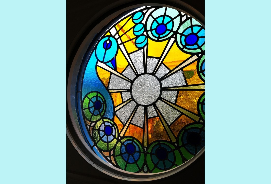 Om de achterburen minder inkijk te bieden in de badkamer, besloot een klant een rond voorzetraam te laten maken met glas-in-lood, net zo discreet als decoratief.